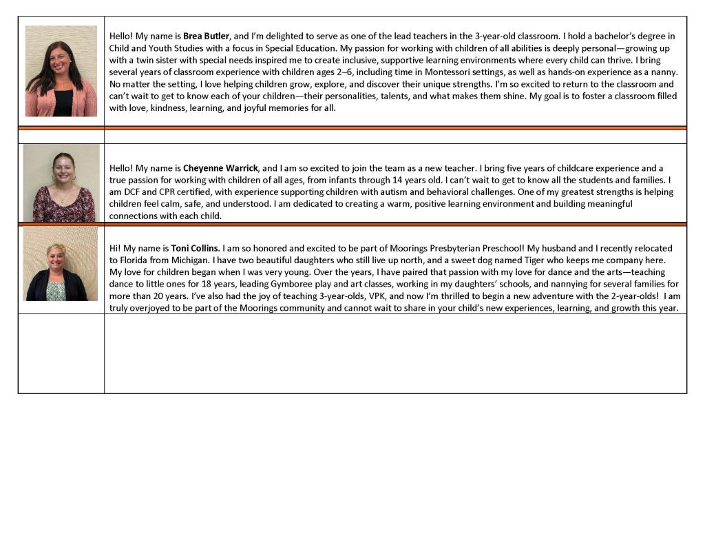 Our teachers bring a wealth of knowledge & experience to The Moorings Presbyterian Preschool. Our staff’s talents & outstanding qualifications make Moorings Presbyterian Preschool the special place it is. One hundred percent of our faculty has numerous years of teaching experience, in public & private schools.