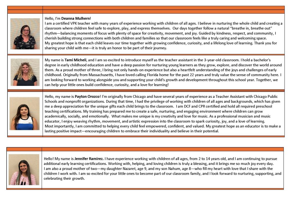 Working in unison, our teachers are the pillars of the Moorings. Our faculty works together as classroom teams. They incorporate current research & ideas into their planning & daily practice. Our faculty participates in 10-15 hours of continuing education each year. All faculty & staff are background checked through the Florida Department of Law Enforcement & F.B.I. & hold current certification in First Aid & CPR.